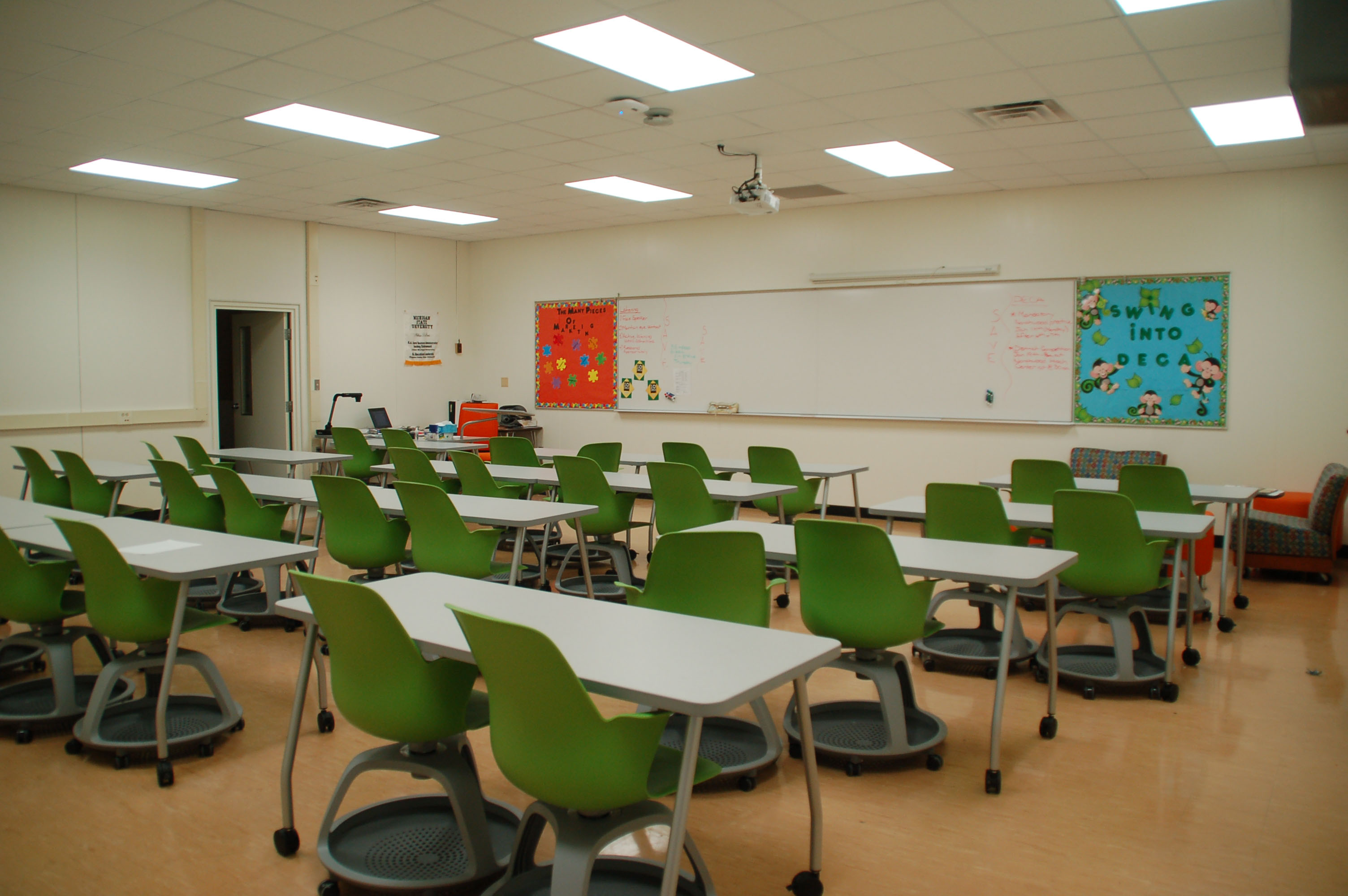 The added furniture includes moveable desks, moveable chairs and mobile informal seating in the front of the classroom. The items to come include a couch, individual white boards for the sides of each desk and larger white boards that will cover the walls of the entire classroom.